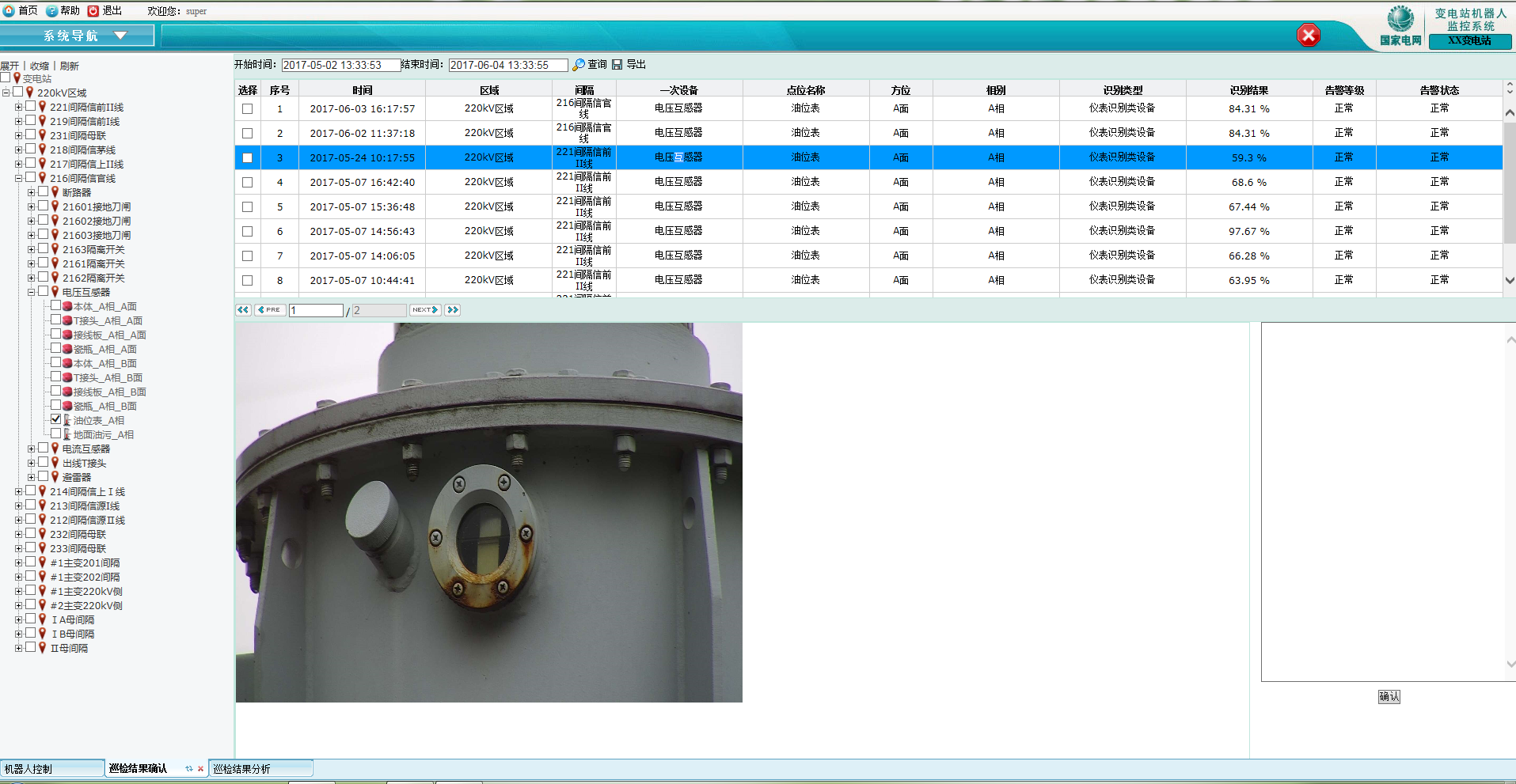 3)點擊『查詢』按鈕實現(xiàn)查詢將顯示所有的巡檢結(jié)果記錄,在下方頁面將顯示所有要搜索的巡檢信息(如巡檢時間、所在區(qū)域、間隔、一次設(shè)備、點位名稱、方位、相別、識別結(jié)果、告警等級、告警狀態(tài));